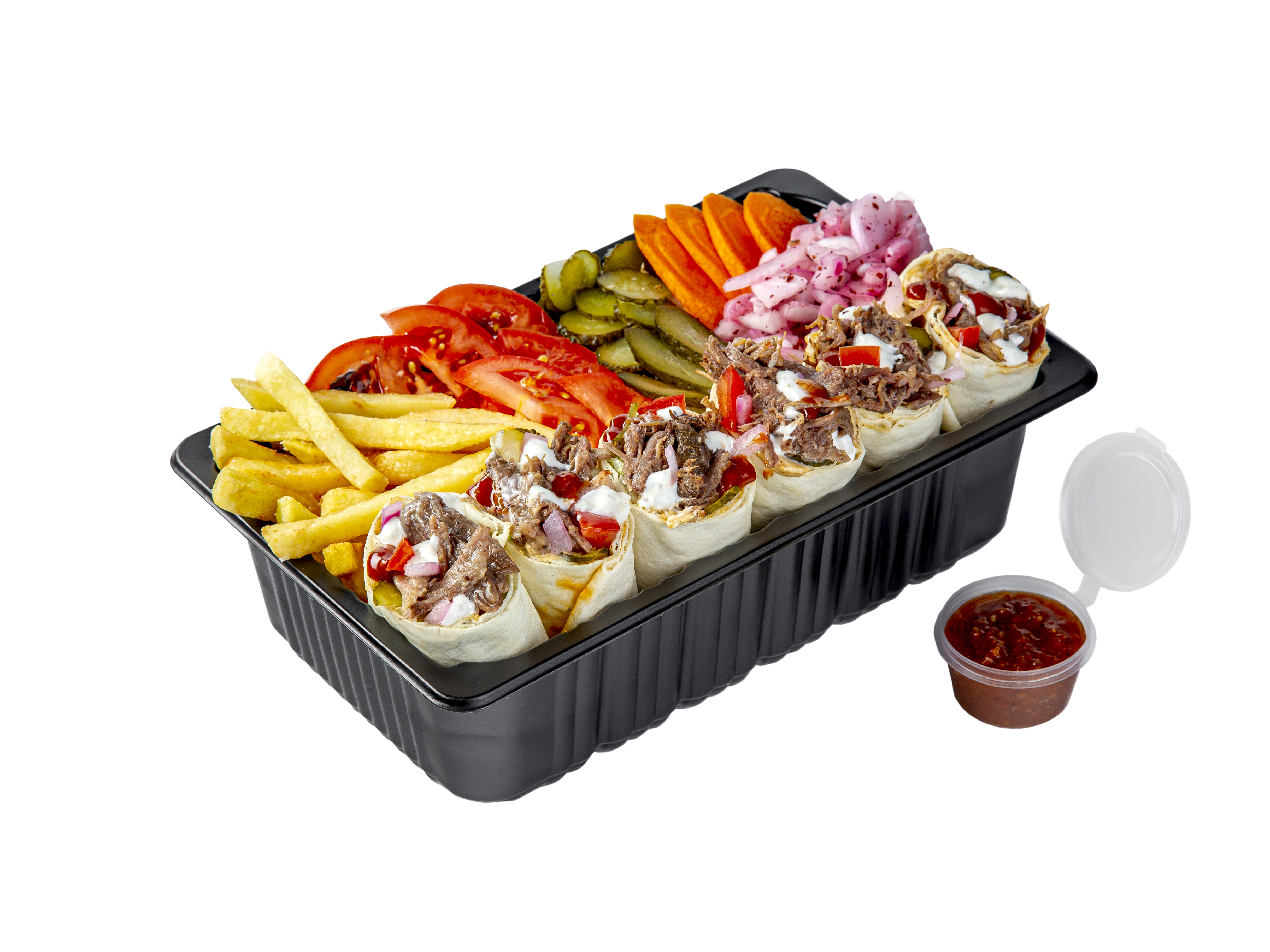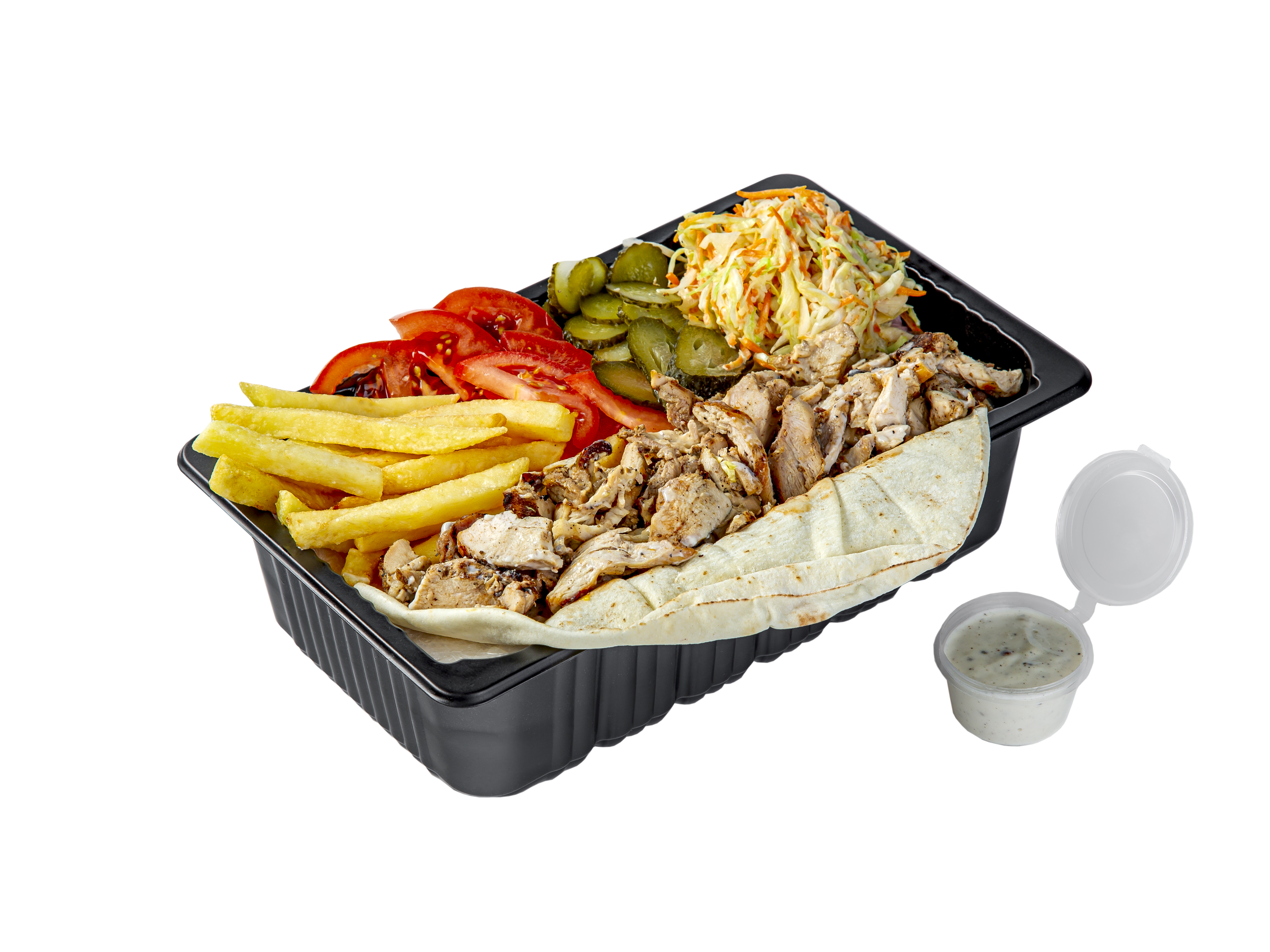 Шаурма в лаваше с сочной курчкой, нарезна на кусочки, подается с картофелем фри, коул слоу, овощами и белым соусом.